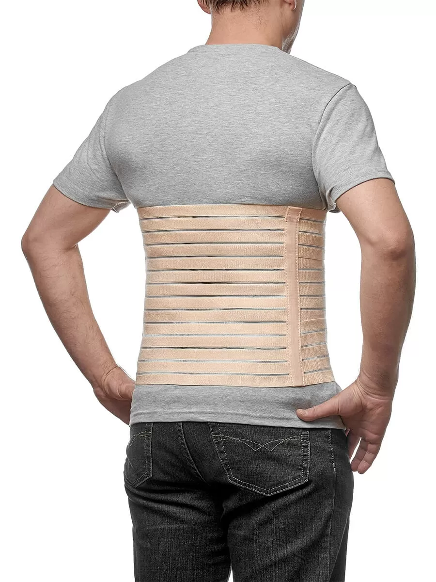 - Бандаж изготовлен из эластичных воздухо- и влагопроницаемых материалов, состоит из широкого пояса на застежке с двумя ребрами жесткости по бокам.