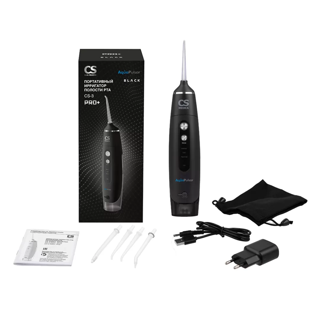 Стильный портативный ирригатор CS Medica AquaPulsar CS-3 PRO+ можно использовать не только в домашних условиях, но и в поездках и путешествиях. Благодаря трем режимам работы с двумя уровнями интенсивности, пользователи подберут комфортное давление струи воды – от 200 до 790 кПа.Для проведения полноценной гигиены ротовой полости в комплект поставки входят 5 сменных насадок: стандартные (3 шт.), ортодонтальная для брекетов (1 шт.), пародонтальная с мягким наконечником для чувствительных десен (1 шт.). Угол наклона насадок составляет 135 градусов для лучшей очистки труднодоступных участков полости рта.