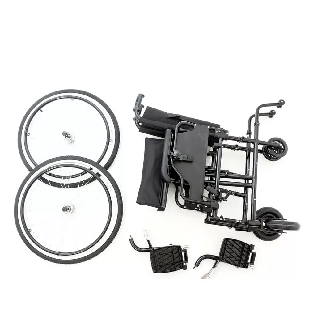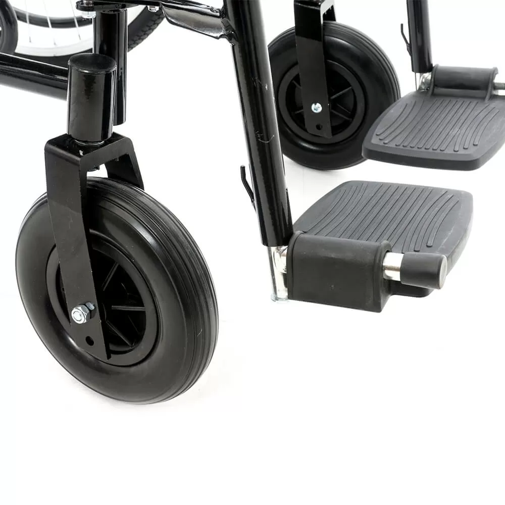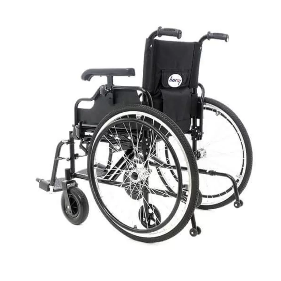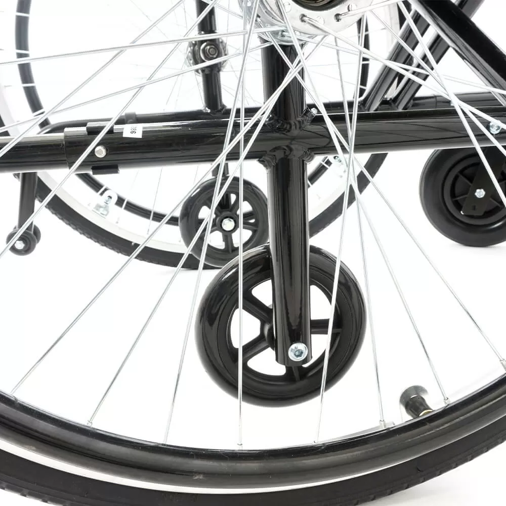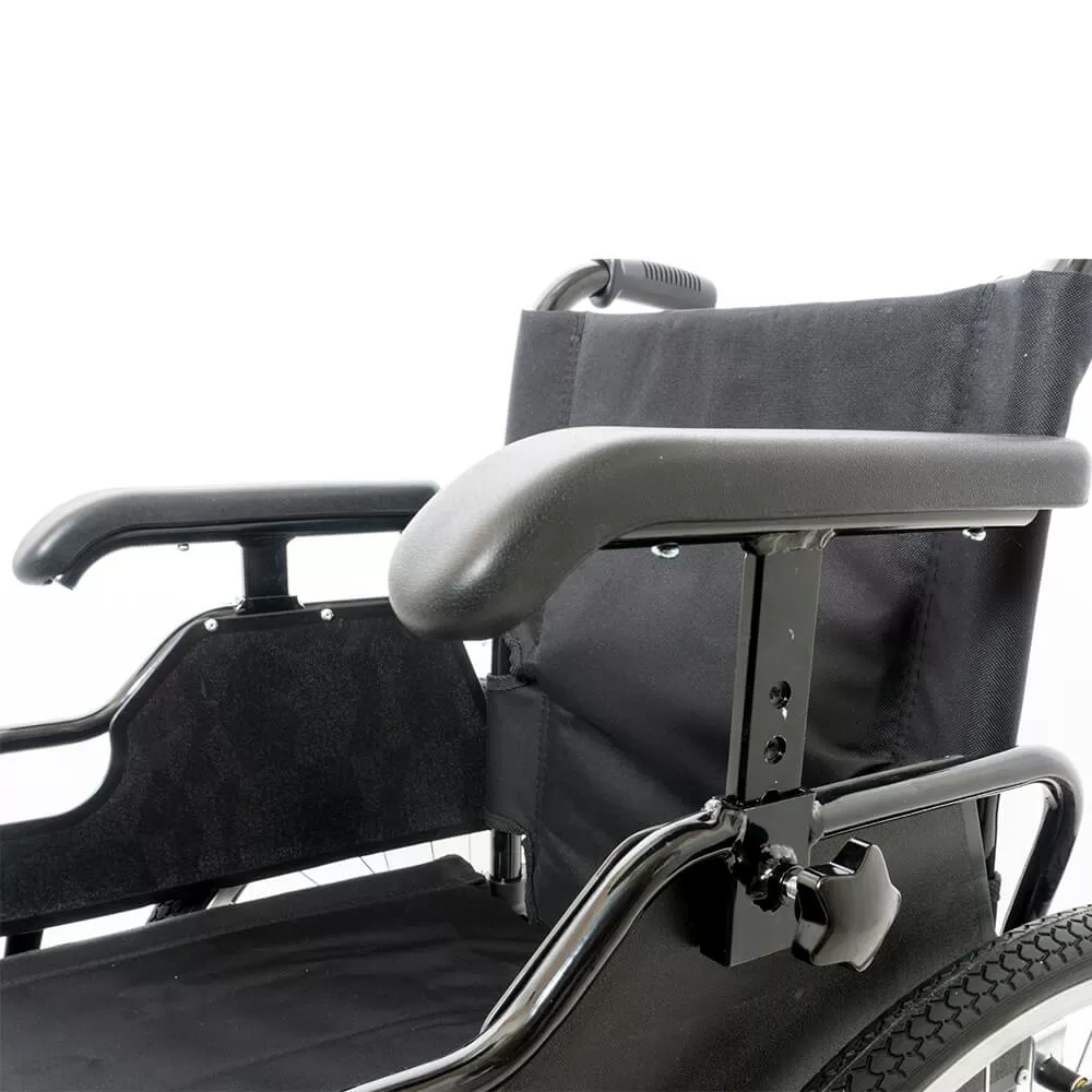 Складная алюминиевая коляска с фиксированной спинкой, откидными подлокотниками и подножками. Оснащена трансферными колесами и съемным антиопрокидывателем, обеспечивающим дополнительную безопасность пользователю при переезде неровностей и препятствий.Материал обивки сиденья и спинки – прочный, долговечный и практичный нейлон. Трансферные колеса позволяют проходить даже в самые узкие проемы с помощью сопровождающего лица.