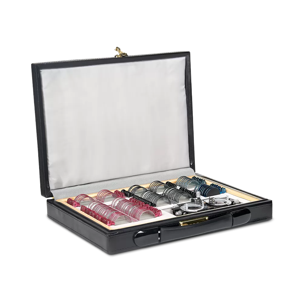 - В комплекте есть специальная универсальная пробная оправа со множеством различных регулировок. Это позволяет проводить обследование зрения пациентам с различной формой головы. Универсальная оправа позволяет установить до 4-х линз одновременно для более детального обследования зрения.