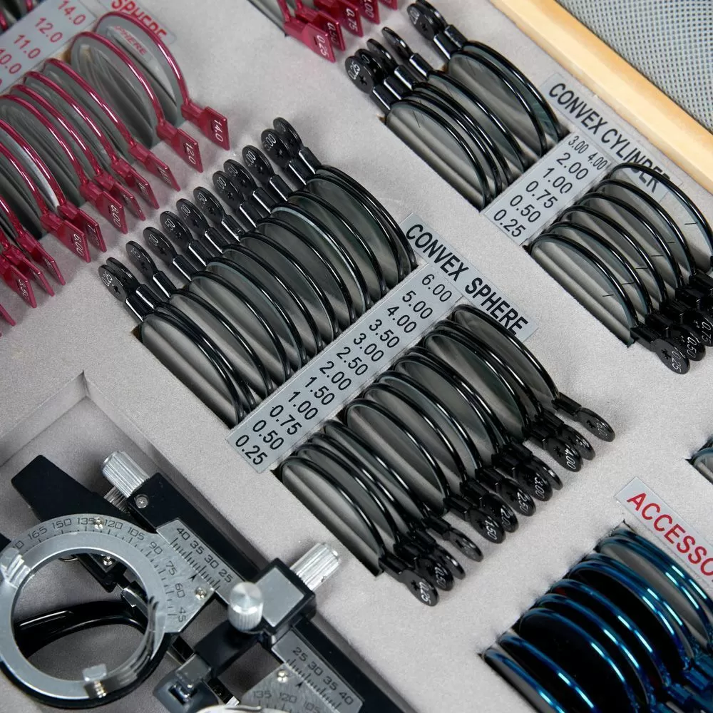 - Для проверки косоглазия и скрытого косоглазия, а также для тренировки структур глаз в наборе представлены призматические линзы. В набор входят парные очковые призмы от 0.5 пр дптр до 3.00 пр дптр