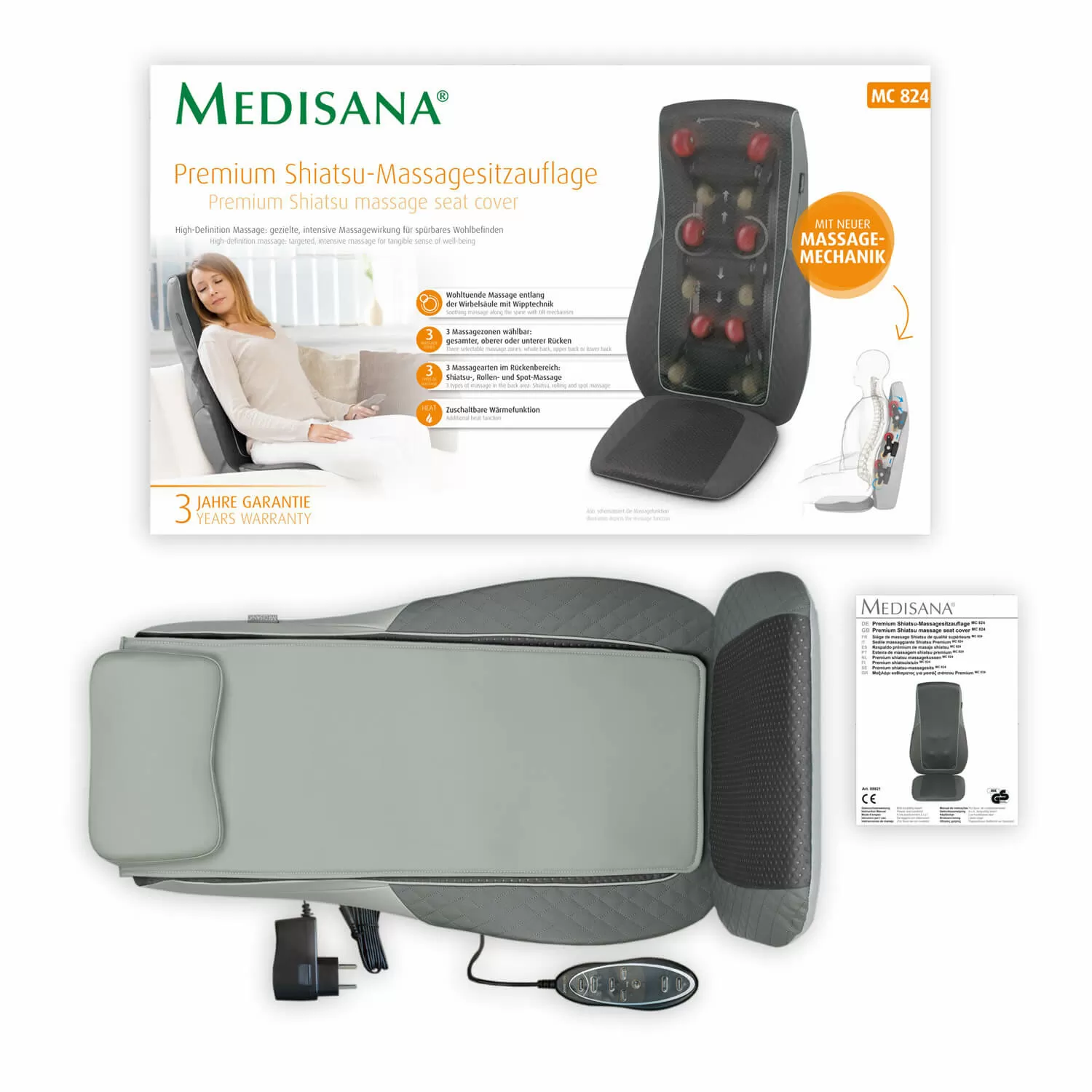 Высокая эффективность устройства достигается посредством 6 массажных головок. Воспользовавшись пультом ДУ, вы сможете подобрать интенсивность и скорость воздействия. Чтобы обеспечить бесперебойное функционирование Medisana MC 824, достаточно произвести подключение сетевого шнура к стандартной розетке.