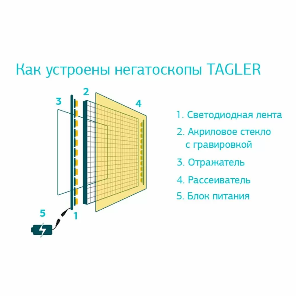 В серии НСД используется особая технология изготовления световой панели, которая позволяет добиться абсолютной равномерности подсветки экрана.В большинстве представленных на рынке негатоскопов используются либо люминесцентные лампы (как в бюджетной серии негатоскопов TAGLER НЛ), либо полоски светодиодов. Лампы или полоски закрепляются на задней стенке светового короба. При таком способе подсветки она получается неравномерной: максимальная яркость достигается в точках напротив источников света.