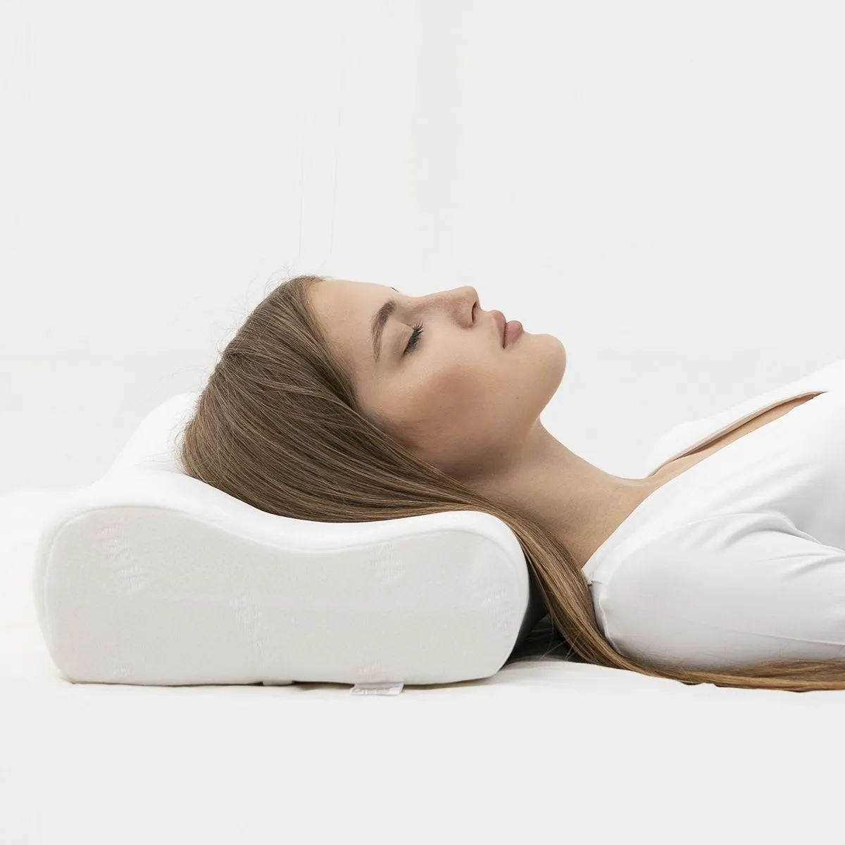 Расположить подушку валиком под шейный отдел. При сне на боку подушку надо располагать высоким валиком под шею, если на спине - низким. Самый физиологичный сон - на бокуИнформация о размерах: