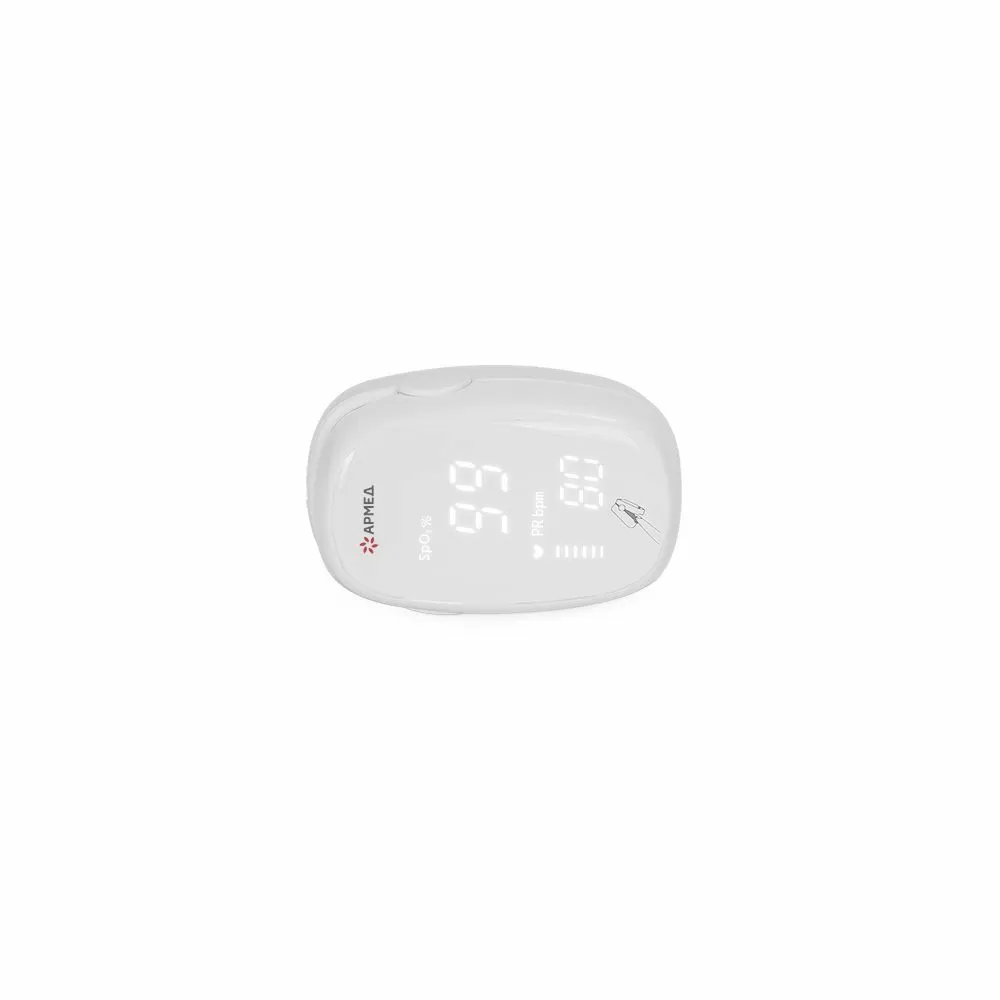 - Пульсоксиметр отличается минималистичным дизайном корпуса и ярким дисплеем, на котором отображаются показатели сатурации, пульса и частота сердечных сокращений.