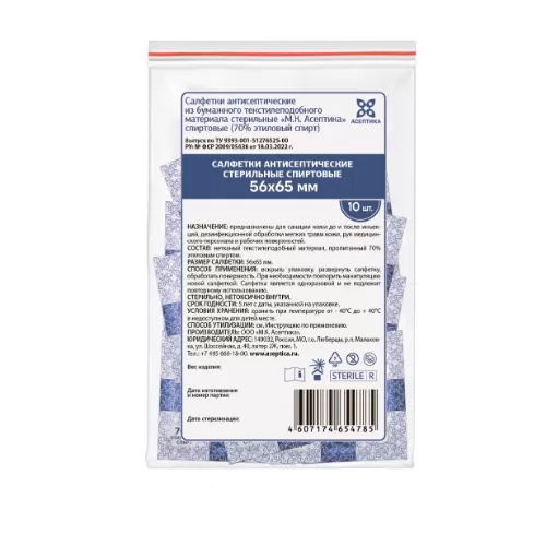 ООО «М.К. Асептика» - первая компания в России, которая начала производить салфетки антисептические спиртовые с 70% этиловым спиртом.Салфетка антисептическая стерильная спиртовая Асептика 56х65 мм. - медицинское изделие.