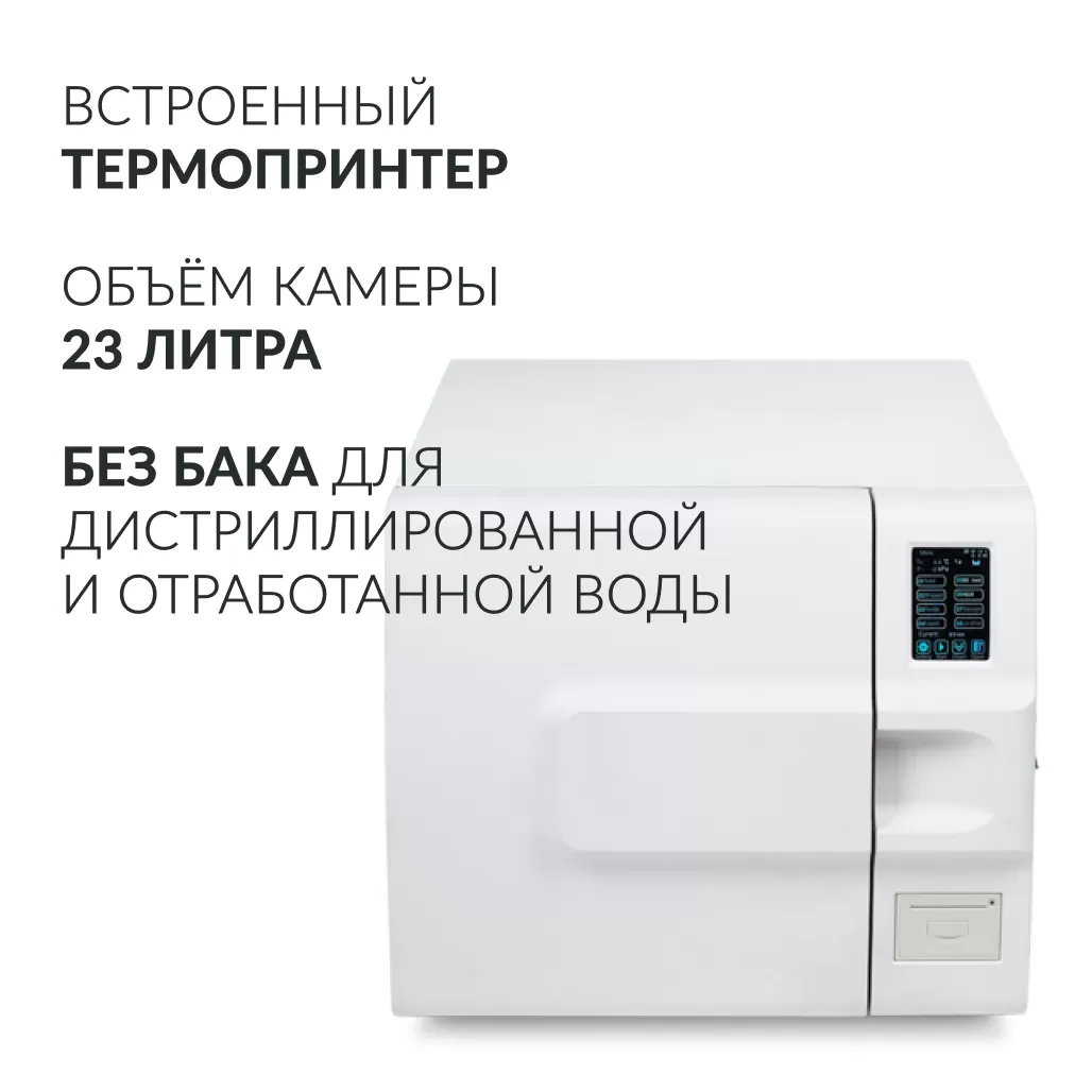 Паровой стерилизатор Армед DGT-23B оснащён вместительной камерой из нержавеющей стали объёмом 23 литра. Рабочие программы предусматривают обработку изделий при температуре 121 или 134 °C продолжительностью от 4 до 30 минут.