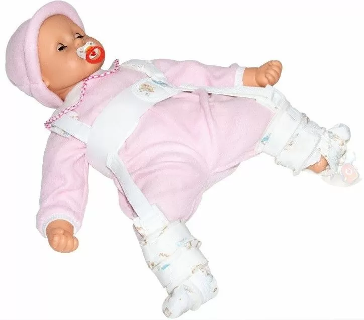 - отрегулируйте степень натяжения ремней на «ботиночках» так, чтобы бедра ребенка находились в положении сгибания и отведения;